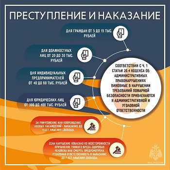Палы сухой травы, разведение костров и сжигание мусора – опасное занятие, которое идет вразрез с законодательством. Так, штраф на гражданина составляет от 5 тыс. до 15 тыс. руб., на должностное лицо – от 20 тыс. до 30 тыс. руб., на лиц, осуществляющих предпринимательскую деятельность без образования юридического лица, – от 40 тыс. руб. до 60 тыс. руб., на юридических лиц – от 300 тыс. до 400 тыс. руб. Если нарушение выявлено в условиях особого противопожарного режима, сумма штрафов увеличивается. В случае уничтожения или повреждения чужого имущества в результате разведения костров или использовании открытого огня возможно возбуждение уголовного дела с возмещением причиненного материального ущерба.